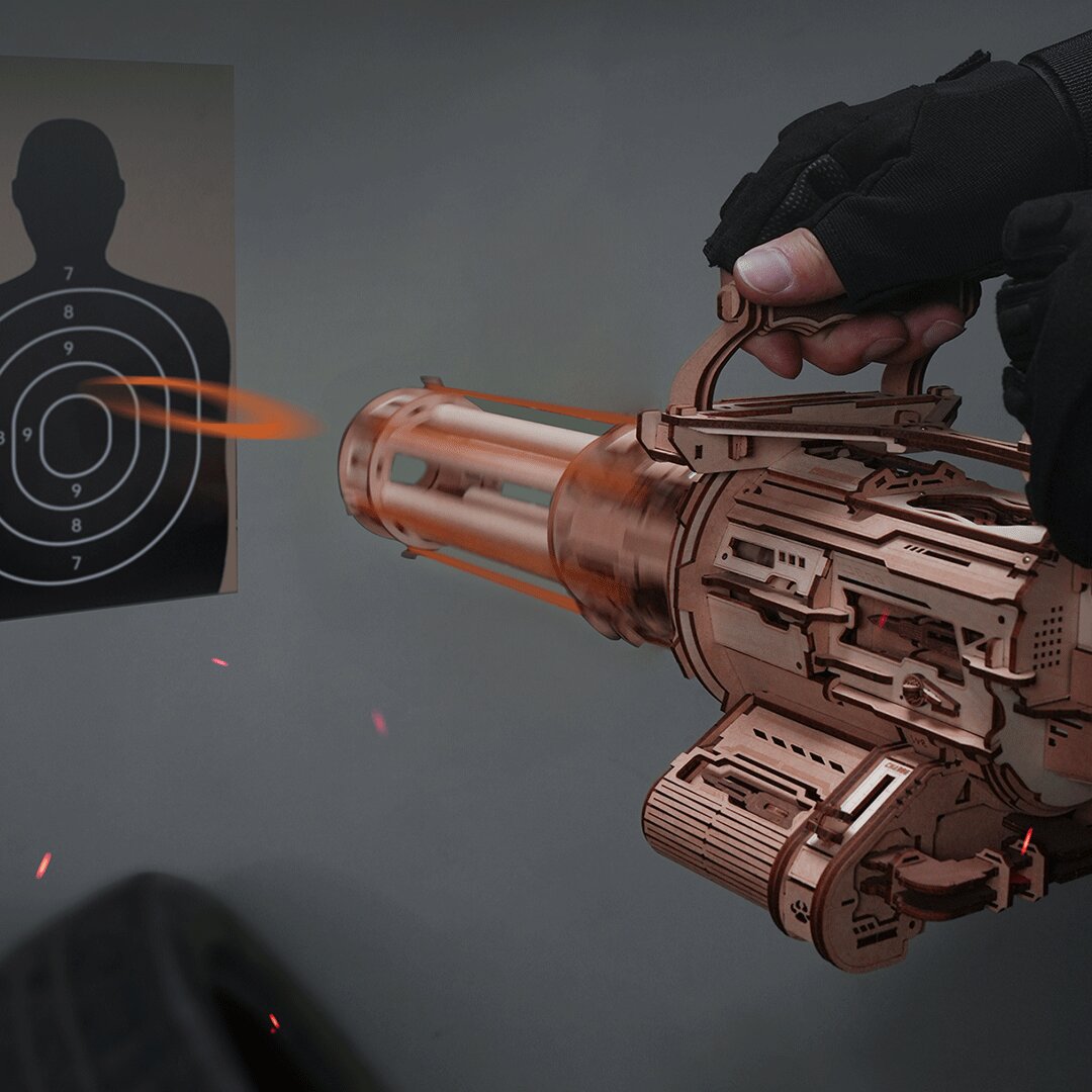 Modelis įkvėptas šiuolaikinių amerikietiškų rotacinių kulkosvaidžių, tokių kaip XM556 arba M134, žinomų dėl didelio šaudymo greičio. Pats pirmasis rotacinis kulkosvaidis – M134 Minigun – yra imperijos tikslumo ir techninio meistriškumo simbolis. Šis medinis ROKR modelis perteikia šią žavią mechaniką kompaktišku ir saugiu dizainu.